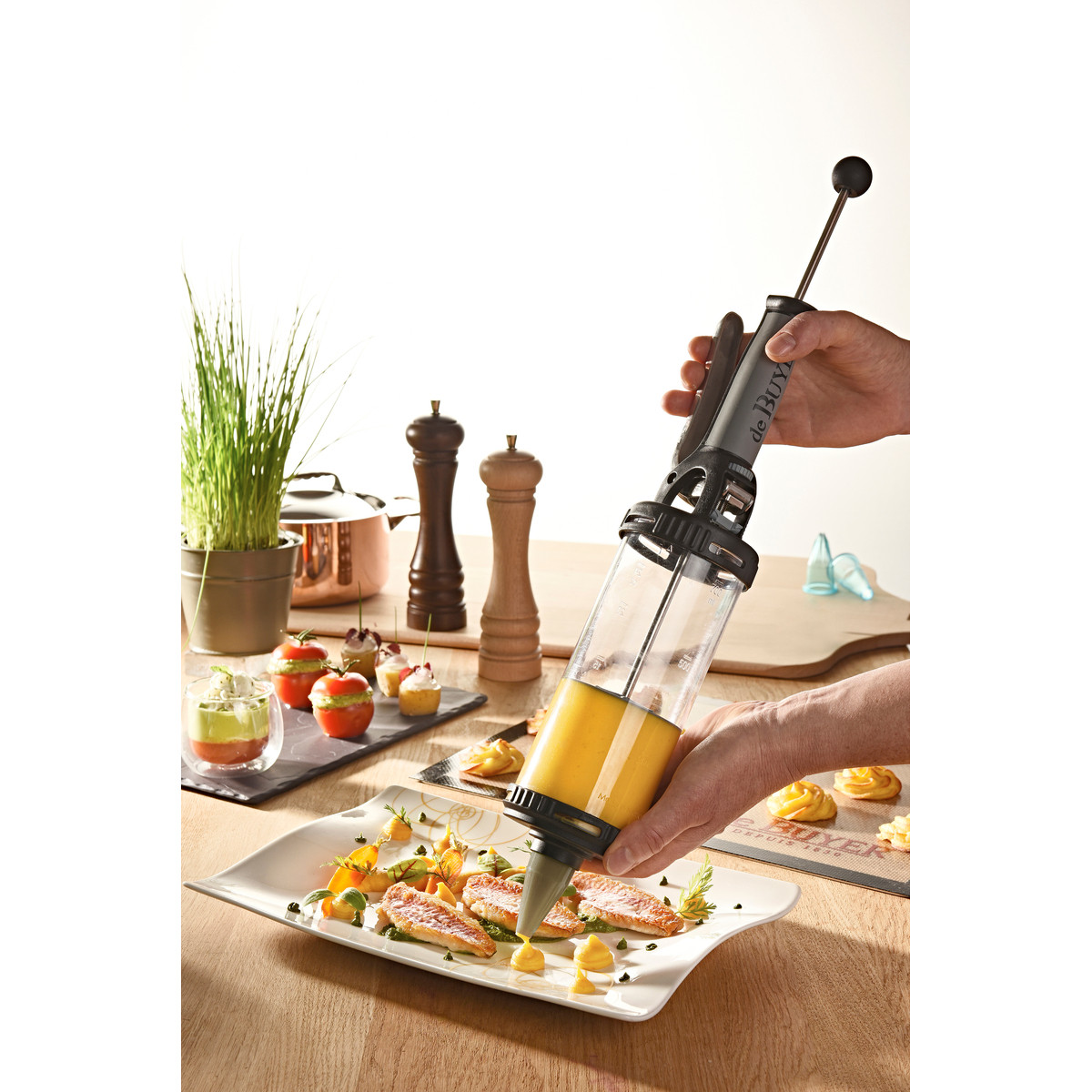 Découvrez le tube Essentiel de la marque renommée De Buyer. Fabriqué en France ce produit allie qualité et durabilité. C produit est composé d'un piston à pâtisserie d'une capacité de 0.75 l ainsi que de deux douilles U8 et D8. Les plus produit : - Conçu en tritan, une matière réputée pour sa résistance et sa longévité.- Grâce à sa transparence, vous pouvez facilement contrôler la quantité de pâte restante dans le tube. Il possède également une molette avec graduation (cl et oz) permettant de régler précisement la quantité.- Polyvalent, il permet de remplir, garnir ou encore décorer.- Facile à nettoyer, ce kit piston passe au lave-vaisselle, vous permettant ainsi de gagner du temps après vos préparations culinaires.- Multi-usages, il peut être utilisé avec de nombreuses préparations (crèmes, mousses épaisses, pâtes à choux...).- Utilisation et assemblage simple et rapide. Ce tube essentiel est l'outil indispensable pour tous les passionnés de pâtisserie qui recherchent précision et facilité d'utilisation !