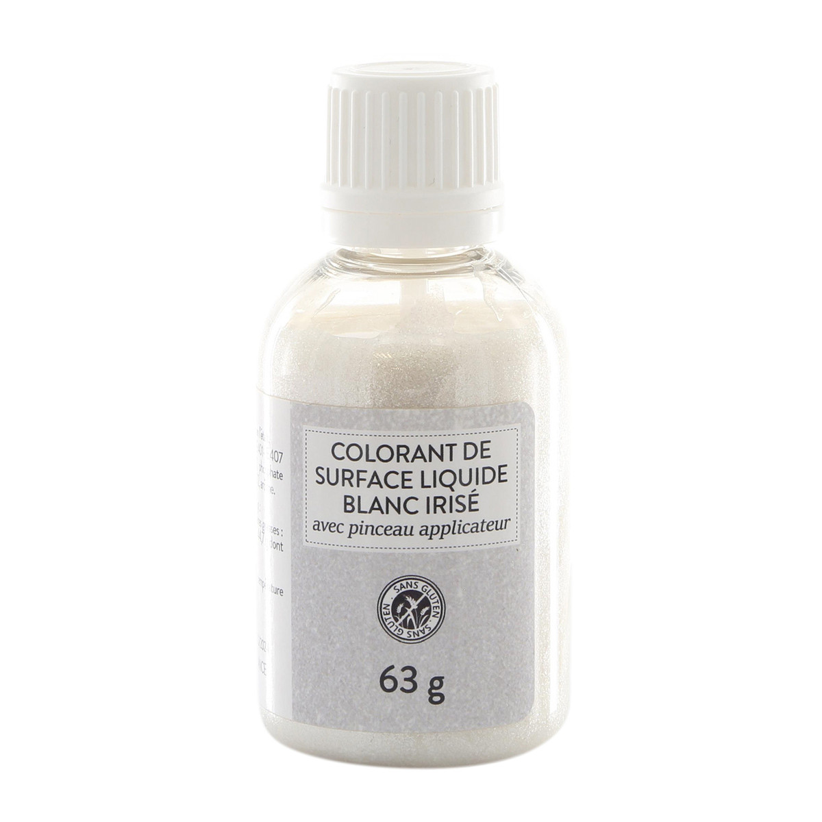 Optez pour ce colorant alimentaire de surface blanc irisé et apportez une touche élégante à vos réalisations. Ce colorant de surface liquide vous permettra de décorer ou de peindre de nombreuses réalisations : biscuits, pâte à sucre, pâte à d'amande ou encore chocolat. Pratique, le flacon de 63 gr est muni d'un bouchon avec pinceau applicateur afin de faciliter le dosage et l'utilisation du colorant. Consignes d'utilisation : - Colorant prêt à l'emploi, secouer le flacon avant toute utilisation.- Produit pour pâtisseries et confiseries, ne pas ingérer en l'état. Ingrédients :Sirop de glucose, eau, pectine, agents texturant : E401- E407 correcteurs d'acidité E330-E331, lactate de calcium E327, phosphate tricalcique E341, conservateur E202, colorants E555-E551-E172, arôme.Sans gluten.
