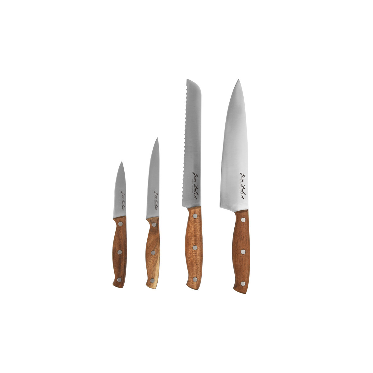 Optez pour ce bloc couteaux tout en un Jean Dubost. Ce bloc est composé de 4 couteaux avec des manches en bois naturel et des lames en inox. Le bloc en lui-même a un affûteur intégré à celui-ci. Tout en bois d’acacia qui possède des propriétés antibactériennes. Pratique et fonctionnel, ces 4 couteaux vont vous être indispensables. L'affûteur est déjà intégré sur le bloc donc pas besoin de se précipiter pour en acheter ! Vous allez pouvoir affûter vos couteaux facilement dès que vous trouvez qu’ils coupent un peu moins bien. Idéal pour des couteaux ayant toujours un tranchant rasoir. Contenu du bloc : - 1 couteau office 9 cm - 1 couteau fruits & légumes 13 cm - 1 couteau à pain 20 cm - 1 couteau de cuisine 20 cm - Bloc en bois naturel d’acacia avec des plaques en métal indiquant le nom de chaque couteau. Affûteur noir intégré dans le bloc Idéal pour épater vos amis ou votre famille lors de vos dîners chaleureux ou même des fêtes de Noël en coupant votre viande comme un(e) professionnel(le). C’est le cadeau parfait pour vos proches. Nous vous conseillons de laver le bloc à la main mais aussi les couteaux pour qu’ils gardent leur tranchant.