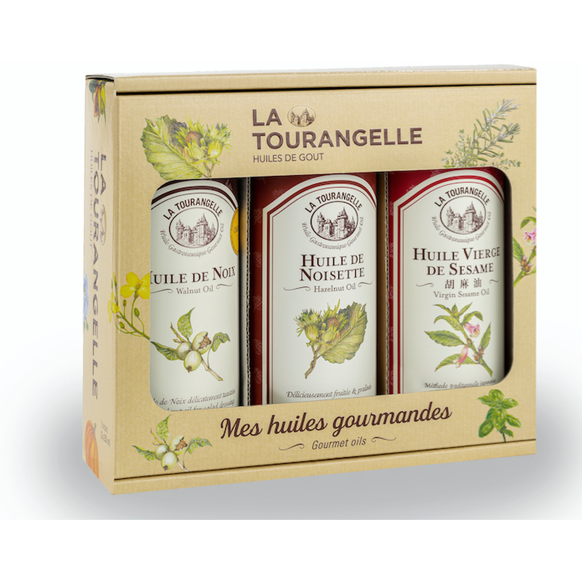 Offrez à votre cuisine de tous les jours, le meilleur des huiles la Tourangelle, un coffret Best Seller ; Préparez votre palais! Réalisé dans le respect des traditions ancestrales françaises dans la vallée de la Loire, la Tourangelle accorde plaisir et nutrition dans leurs huiles d'exception à la fois saine et savoureuse. Toutes les huiles artisanales la Tourangelle sont SANS GLUTEN ! Ce coffret trio huiles pourraient bien devenir un incontournable de votre cuisine. Sesame, noix et noisettes, c'est un véritable feux d'artifice de saveurs et de créations que vous propose la Tourangelle. Laissez parler votre créativité ! Ce coffret est LE cadeau idéal pour les marmitons avides d'aventures gustatives et gourmandes!