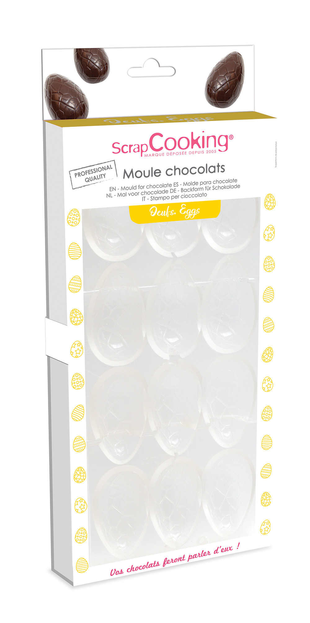 A vous les œufs de Pâques fait maison cette année grâce à ce moule de la marque Scrapcooking ! Avec ce moule rigide en plastique adapté au contact alimentaire, vous pourrez réaliser 6 oeufs en chocolat brillant, de qualité professionnelle en un rien de temps. Pour cela rien de plus simple: - Il vous suffit de faire fondre votre chocolat au lait, blanc ou chocolat noir au bain-marie. (Afin de contrôler la température de votre chocolat rien de plus pratique qu’une spatule thermomètre ou une tempéreuse qui vous garantira un résultat parfait). - Il ne vous restera plus qu'à placer le chocolat dans les différentes empreintes du moule, de le laisser refroidir au réfrigérateur pour le laisser durcir et d’assembler vos œufs à l'aide d'un peu de chocolat fondu. A offrir ou à partager en famille, vos délicieux chocolats feront l’unanimité !