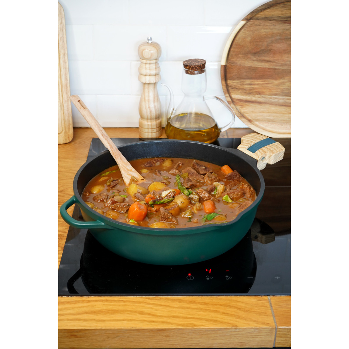 La poêle revêtue en fonte d'aluminium de 28 cm, modèle La fabuleuse, de Cookut, est un choix parfait pour vos besoins culinaires. Fabriquée en fonte d'aluminium de haute qualité, cette poêle offre une conductivité thermique exceptionnelle pour une répartition uniforme de la chaleur sur toute la surface de cuisson. Vous pouvez cuisiner en toute confiance sans craindre que vos aliments n'adhèrent à la surface. Avec un diamètre de 28 cm, cette poêle est idéale pour saisir, griller et dorer une variété d'aliments. Que ce soit pour cuire des légumes, des viandes ou des poissons, vous obtiendrez des résultats savoureux grâce à la rétention de chaleur de la fonte d'aluminium. La poignée ergonomique de la poêle offre une prise en main confortable et sécurisée, facilitant ainsi son utilisation. De plus, cette poêle est compatible avec toutes les sources de chaleur, y compris l'induction, vous permettant de l'utiliser sur votre cuisinière préférée. Elle passe même au four sans la poignée détachable (240°). Livrée avec une poignée, une anse, un panier vapeur, un couvercle et une spatule. Avec son design élégant et moderne, la poêle La fabuleuse de Cookut ajoute une touche de style à votre cuisine. Que vous soyez un cuisinier amateur ou un professionnel, cette poêle polyvalente sera un atout précieux dans votre arsenal culinaire.